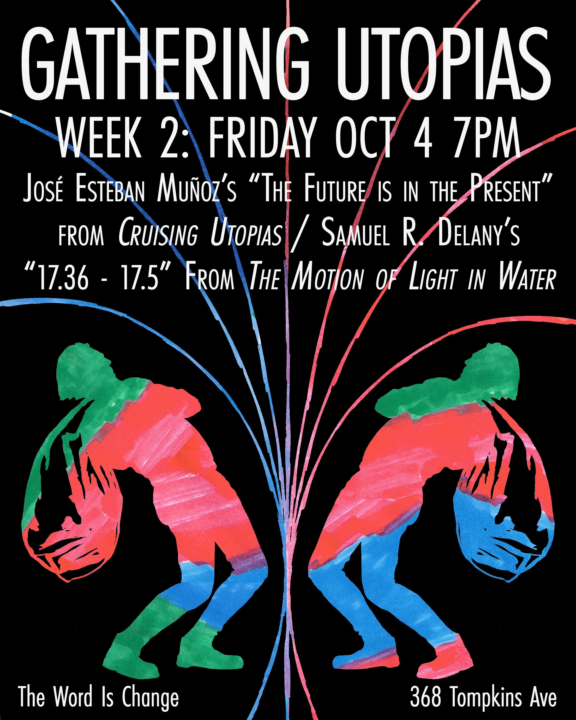Thanks to everyone that came out for the first session of the Gathering Utopias reading group! Return or join us for the first time Friday Oct 4th when we will be discussing José Esteban Muñoz’s “The Future is in the Present” from Cruising Utopias and Samuel R. Delany’s The Motion of Light in Water sections 17.36 - 17.5. These readings are part of Julie & Elizabeth’s Anti-Capitalist Concert Series, which programs music and conversation to envision an anti-capitalist future. In conjunction with the upcoming Gathering Utopias concerts, we have planned a three-week reading group on the utopian imaginary We previously read Ursula K. Le Guin’s “The Carrier Bag Theory of Fiction” and Alexis Pauline Gumbs’s “Evidence” from Octavia’s Brood: Science Fiction Stories from Social Justice Movements. The last meeting is October 11 with readings TBA. All events at The Word Is Change on 368 Tompkins Ave. Attend one or all!