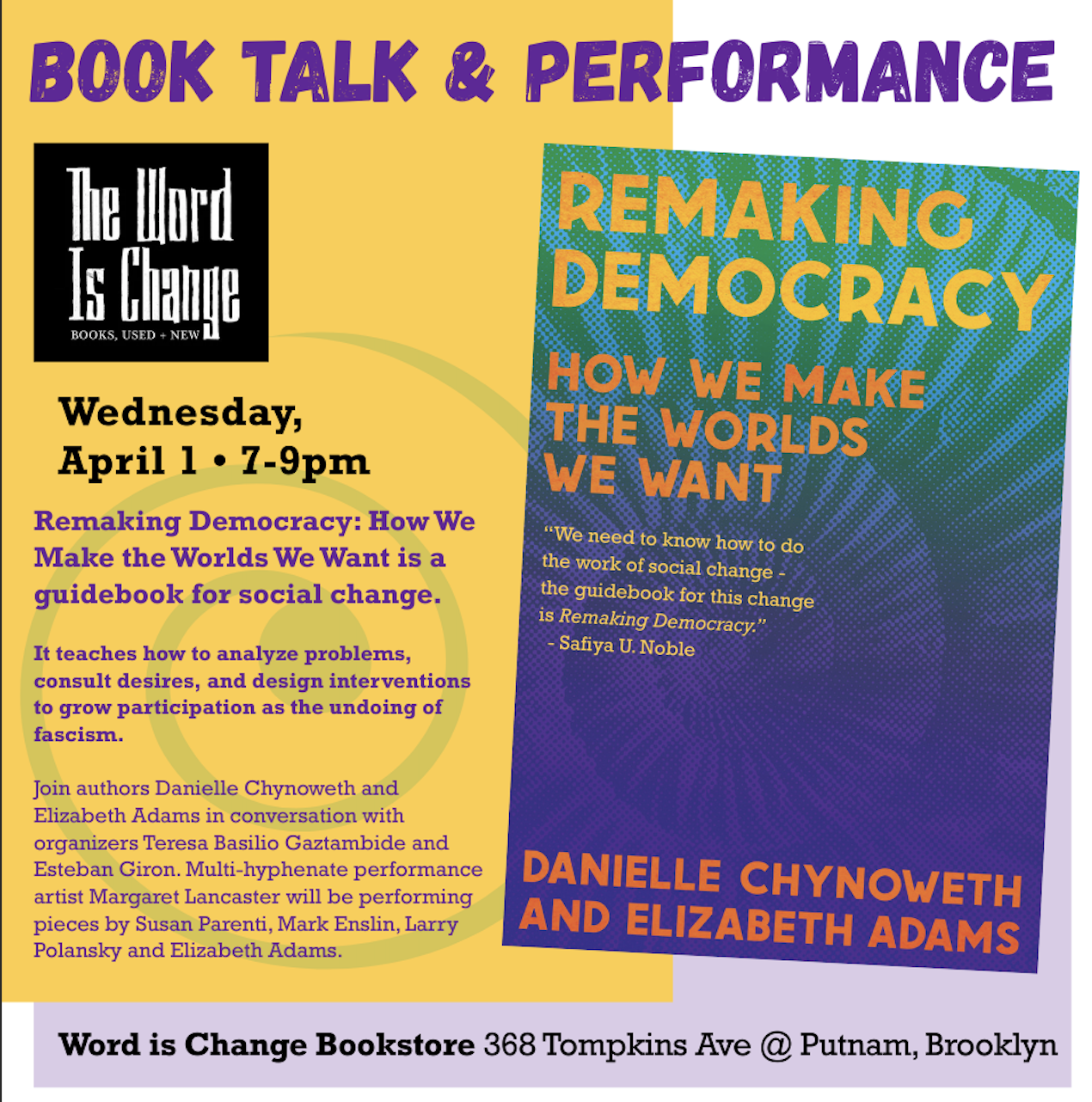 Remaking Democracy: How We Make the Worlds We Want (Common Notions) is a guidebook for social change. It provides strategy and tools to create a more just and desirable future for everyone. It empowers people from all walks of life to analyze root causes of the problems we face and design actions, transforming ourselves as we transform the world. Stories of successful projects illuminate the book’s theory in action. Remaking Democracy teaches how to proliferate participation and grow democratic practices, so that those affected by systems can become their creators. It equips us to design the abundant variety of solutions our surviving and thriving require.